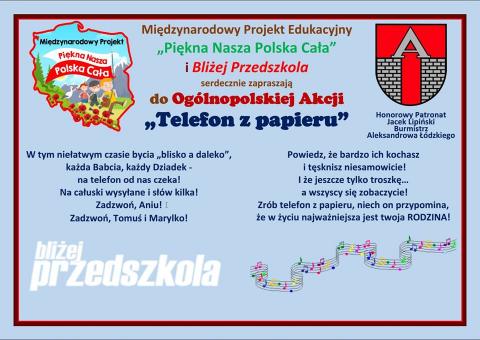 Kwarantanna domowa to szczególny czas zarówno dla nas dorosłych, jak i dzieci. To również wyjątkowy i trudny czas dla osób samotnych i starszych, również naszych dziadków. Wychodząc naprzeciw potrzebom naszych seniorów serdecznie zapraszamy do udziału w Ogólnopolskiej Akcji „Telefon z papieru”. Głównym jej celem jest sprawienie niespodzianki naszym dziadkom. Chcemy ich ucieszyć poprzez zaśpiewnie im przez telefon piosenki autorstwa Marii Tomaszewskiej pt. „Telefon z papieru”.