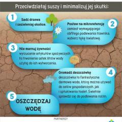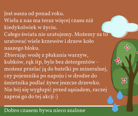 Chociaż obecnie wszyscy jesteśmy skoncentrowani na zagrożeniu związanym z pandemią COVID-19, to jednak musimy zwrócić uwagę na inną bardzo trudną sytuację, jaką jest grożąca nam w tym roku susza. Już teraz naukowcy ostrzegają, że tegoroczna susza może być największą od 100 lat. Konsekwencje dla nas mogą być naprawdę dotkliwe, a nawet tragiczne. Już teraz brakuje wody, na polach i w lasach jest bardzo sucho. Tydzień temu, w niedzielę wybuchł pożar w Biebrzańskim Parku Narodowym, który był prawdopodobnie konsekwencją beztroskiego i bezmyślnego zachowania ludzi, jakim jest wypalanie traw. Susza to nie tylko problem pożarów. Zagraża ona również roślinom i zwierzętom. Dlatego tak ważne w obecnej sytuacji jest oszczędzanie wody. Dotyczy to każdego z nas. Podczas wielu codziennych czynności możemy znacznie zmniejszyć zużycie wody. Zmywając naczynia, robiąc pranie, myjąc zęby czy podlewając rośliny. Musimy tylko zmienić nasze myślenie i przyzwyczajenia.