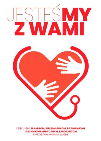 Zachęcamy wszystkich do wzięcia udziału w akcji JesteśMY z Wami, która polega na pokazaniu jedności z pracownikami służby zdrowia. Walka z pandemią koronawirusa jest szczególnie trudnym wyzwaniem dla pracowników i pracownic systemu ochrony zdrowia. Pracownicy medyczni są na pierwszym froncie walki o nasze zdrowie i życie, jednocześnie codziennie narażają swoje zdrowie. Lekarze i pielęgniarki stawiają czoła i pracują intensywnie nad badaniem i leczeniem, ale w szpitalach przez całą dobę pracują też setki tysięcy innych pracowników i pracownic, ratowników medycznych, salowych, sanitariuszy, osób sprzątających, diagnostów laboratoryjnych, techników, kierowców, wolontariuszy, pracowników obsługi, farmaceutów.