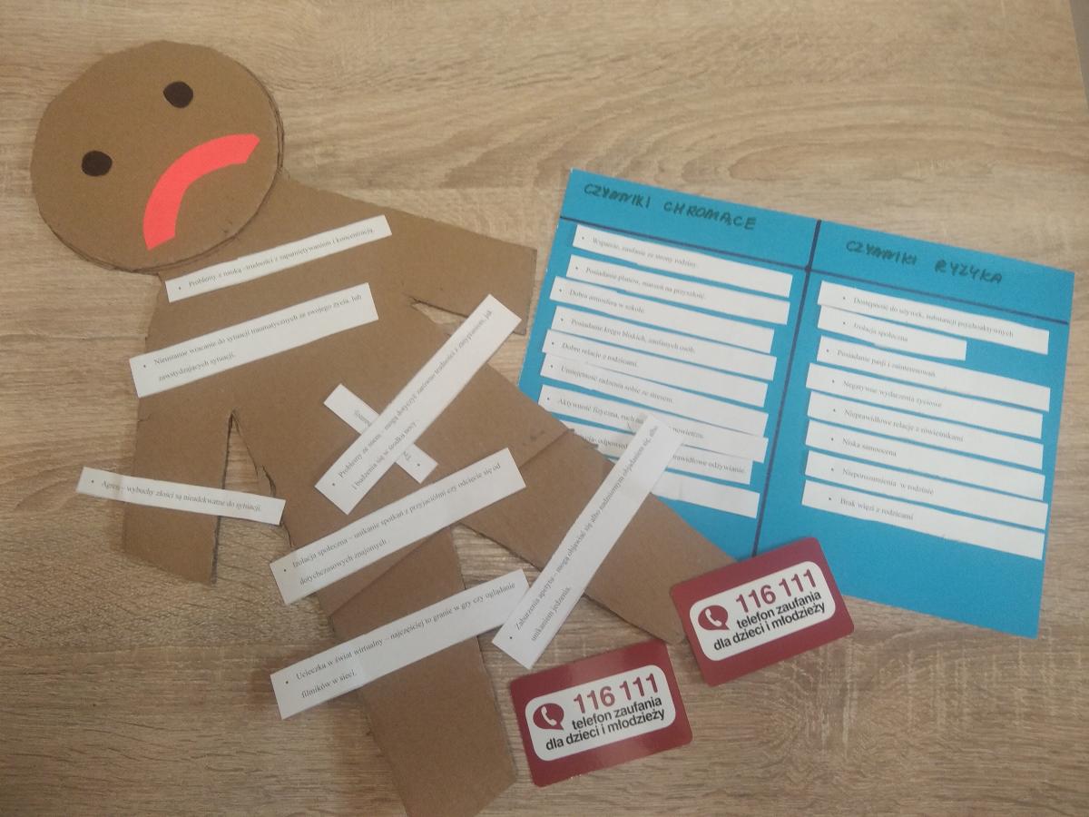 Nasza szkoła dołączyła do akcji Depresja- Rozumiem- Wspieram W ramach tego przedsięwzięcia odbyły się zajęcia z zakresu profilaktyki depresji mające na celu zwiększenie świadomości społecznej. Uczniowie zostali wprowadzeni w temat zajęć: Kiedy świat traci kolory…, następnie odczytywali zapisane na karteczkach objawy depresji i przyczepiali do wyciętego z kartonu konturu człowieka. Podczas tej części zajęć zwrócono uwagę, że depresja jest podstępną chorobą i może przybierać różną postać i dotknąć każdego. W kolejnej części uczniowie zapisywali na kartkach czynniki chroniące nas przed depresją oraz czynniki ryzyka, podawali przykłady, jak zadbać o swój dobrostan psychiczny- poczucie szczęścia i zadowolenia z życia, które dla każdego może oznaczać coś innego. Na zakończenie zajęć poproszono, żeby być uważnym na drugiego człowieka ( koleżankę/kolegę) i w razie potrzeby reagować- zgłosić wychowawcy, psychologowi lub pedagogowi szkolnemu .